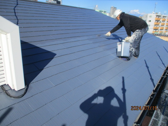 上塗り2回目は本当の意味での仕上げになりますので完全乾燥までを計算して作業をします、塗料の乾く前に雨が降るとやり直しどころか溶剤系は雨あとがブツブツ模様になり成分が分離して光沢もなくなり白化などの症状、水性塗料では折角塗った塗料が乳化もどりして流れ雨樋から排水口、そして河川、海へと流れ大問題です。冬季の乾燥時間不足による塗膜のかぶり、強風によるごみの付着などにも経験による対策も要求されます。最近は雨雲レーダーなどを利用して雷雲の接近にも対応可能になり便利な時代にもなりました。塗料によっては中塗りとの表面の粘りを感じる時や素地の表面凹凸が大きい場合があり上手く塗れない場合もありますが、その場合は気温による塗装面の表面温度や湿度まで含めてメーカー仕様書に沿った可使時間や希釈率、塗布量、塗装法などで対応致します。塗料の耐候性は色の混合比率にもよりますが真っ黒よりはダークグレー、真っ白よりはアイボリーホワイトのほうが長持ちはします、単一色(黄色、赤、青、黒、白など)や鮮明な色(ビビッド色)パステルカラーなども変退色防止性は劣ります、樹脂成分(ウレタン樹脂、シリコン樹脂、フッソ樹脂)により劣化年数は違いますが鮮やかな色より淡い色のほうが退色が徐々に進行するので目立たない面もあります。塗遮熱塗料にもメーカーにもよりますが種類もたくさんあります、塗り替えには必ず提案いたします、素材下地の表面を直射日光による遮熱、劣化を防ぐ作用もあり、屋根裏の温度を外気より夏は涼しく冬は暖かくする効果があるので近年の電気料金の負担も軽減することも可能です