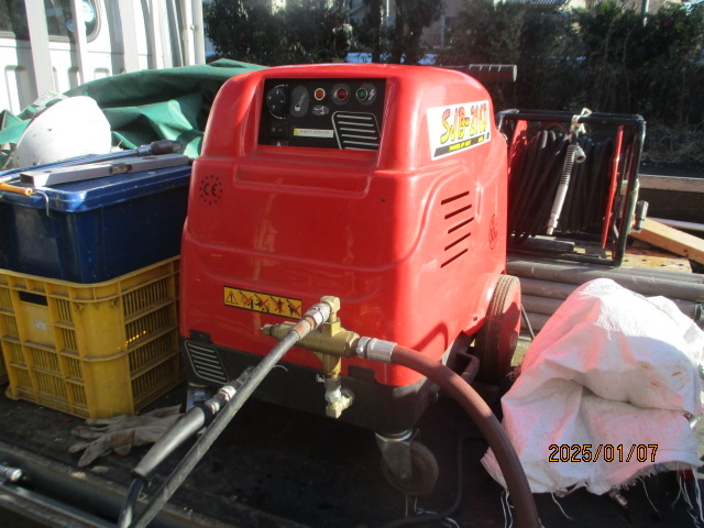 精和産業の高圧洗浄機です。洗浄機は塗装店にとっては必要不可欠な道具になります、塗り替え作業においては外壁の汚れおとし、黒カビ、藻、チョーキングなどのほか、鉄部の塗膜の剥離、ケレン清掃作業などにも使用します、この洗浄作業を行わなければ塗装ができないほどこの工程はとても重要となります。また高圧による建物への洗浄水の侵入、腐食、劣化下地の損傷、作業者自身の体の安全にも、また近隣に配慮して作業を施工します。