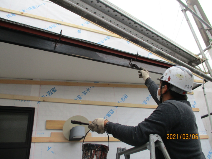 最近の住宅では木部を外部に使用することは少なくなりました。以前は当たり前に破風板や窓枠、雨戸などに加工のしやすさなどから外部にも塗装箇所は多くありました。アルミサッシなどの普及により窓枠、雨戸などはなくなりましたが、20年ほど前までは新築住宅の破風板には多く使用されていました、主に杉や松などの木材を塗装しましたが日当たりの強い、西面などで塗膜の剥離、ひび割れなどが発生して新築引き渡し後2年から3年くらいで補修塗装によく行きました、原因は木部の透湿性によるものだと思います、また松などの木材は日当たりにより内部から松やにが発生して相性により塗装の剥離が生じます、素材の吸い込みを止めるために、光沢を出すために塗膜は厚くなりますが、厚く塗装するほど木の特性を妨げ結果として塗装の不具合が生じます。湿気の吸放出を繰り返し呼吸しています。木は呼吸する自然素材です、木の呼吸を妨げない塗料で塗装をお勧めいたします、木部用塗料を使用してからすでに30年くらいなりますが、新築工事における不具合はなくなりました、塗り替えでも使用していますが、厚く塗られた剥離している旧塗膜でも下地処理をしっかりと施工することにより10年以上の塗装の目的である保護と美装の役目を果たします。