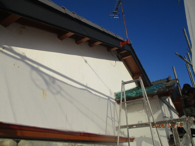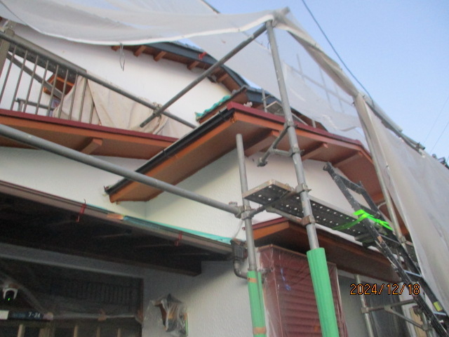 今回の現場の一番苦労した部分になります。増改築?によると思われる収まりで作業困難(手が入らないし、その下部は錆びて腐食穴あきあり)で高圧洗浄作業までは分からずに水圧で穴が開いてしまいました、もともと腐食しており雨漏りの原因にもなりますし塗装を何回塗り重ねても無理な部分になります。釘も打てないビスも効かないし、床を取り外したりも考えますが、結局板金を加工する前に予め下塗り上塗り1回目を塗装してから寸法を測り、現場で切断加工して、仮取付け確認後、速乾性コーキングにて圧着取付け、乾燥まで木を加工して押さえ完全にコーキングが固まったらすき間からローラーの柄を少し曲げて屋根に厚紙で養生して上塗り2回目を施工しました。