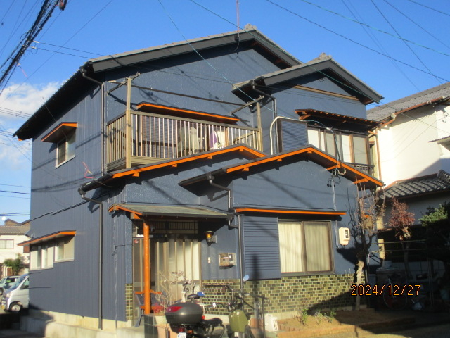 住んでいる人が一番相性のよい色彩を理解しているということ、色を決める際は自分たちも提案を致します、長年の経験則により無難な色の提案をしていることを実感しました、例えば正面のモルタル下地のスタッコ模様は淡彩色でトタン部分を同系色の2段階くらい濃色にする、木部はライトブラウンくらいの落ち着いた木の色をイメージしておりましたが、お客様からメールで指示された色合いによりこの仕上がりになりました。トタン部分はガルバリウム鋼板の既製品色です、日本霧除け、玄関柱などは木目を生かす塗装を考えていましたが鮮やかな色になりました。そういえば昭和時代の塗り替えではよくこの色を使用したことがあります、経年劣化した木部の塗り替えはペンキ調に塗装することがありました、濃紺色と木部色のバランスは角地の立地条件にもより近所にもとても評判は良く施工した私達もとてもうれしく思います。ありがとうございました。