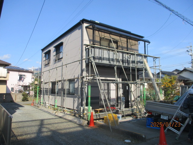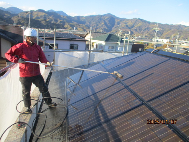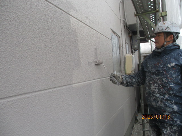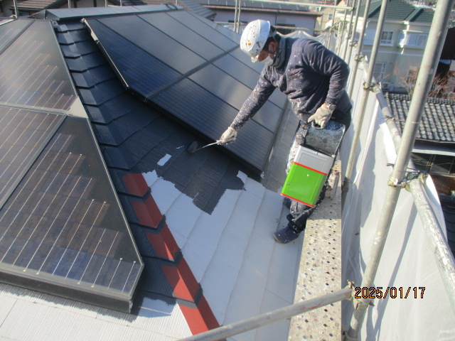 塗装を施工する前工程として足場を組み立て、飛散防止メッシュシート屋根や外壁の水道水による高圧洗浄作業を施工致します。この時しかできない仕事を意識しています、例えばこの現場だとソーラーパネルとかアクリル板の洗浄などがあります、またはルーバータイプの裏側雨戸板はにほこりが積もっていますので高圧洗浄作業の際に取り外して洗い流します、とてもきれいになります。外壁は骨材吹き付けの仕様の塗り替えになります、素手で触ると痛いくらいに表面が尖っているのでスクレーパーで均一に目ならし、下地処理をしてから塗装工程に入ります。この工程を省くと尖った部分は塗膜が極端に薄くなってしまい折角の高額な機能性塗料の性能を十分に発揮できず、また上塗りの隠ぺい性も少なく仕上がりは期待できません。前日の屋根、外壁の高圧洗浄作業のため翌日は塗装作業は慌てることなく乾燥時間を確保するため、気持ちも余裕があり2人で半日くらいの時間で下地処理を施工しました。