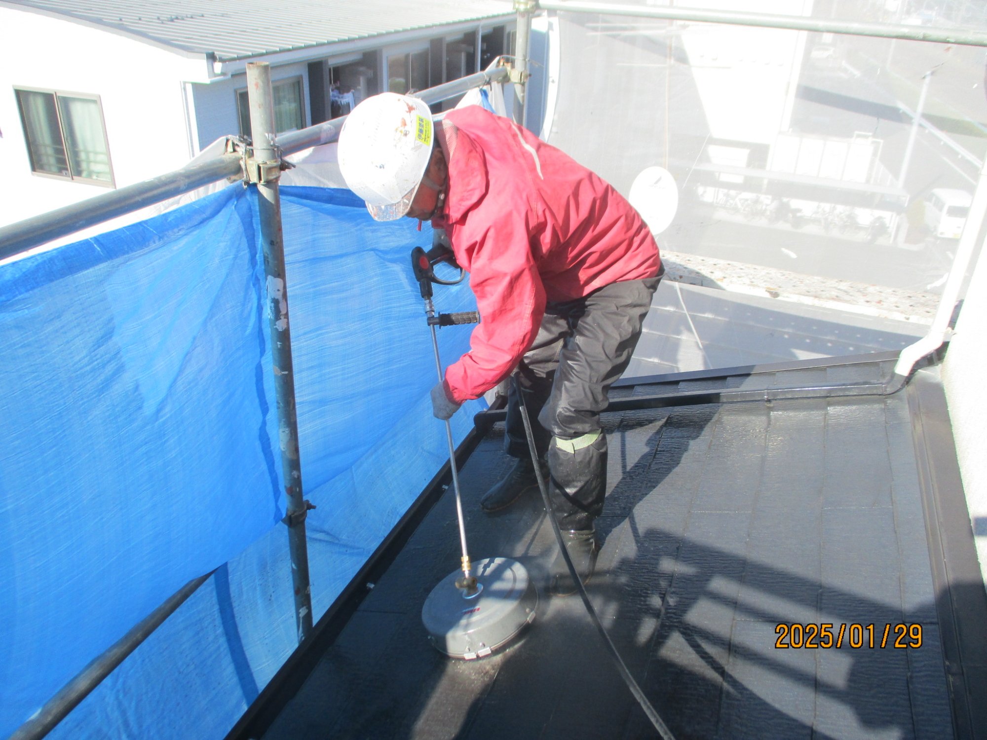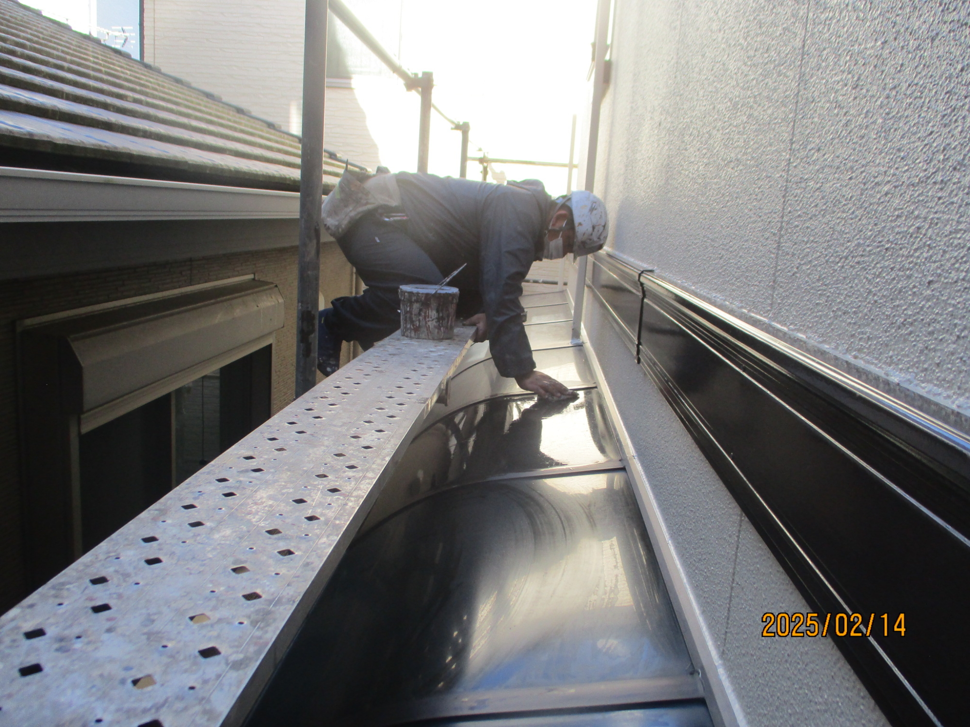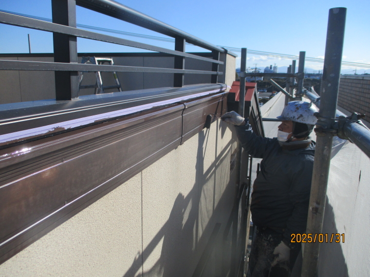 都市部の隣接している3階建ての住宅になりますので足場屋さんにも設計図面を渡しての詳細の打ち合わせまでしましたが、北面の建物巾に設置のエクステリアをクリアするにあたり隣地敷地内足場になってしまうこと、東面の隣宅の高所外壁に壁あたりが必要なことや正面の2台の駐車が確保できないなどの制約があり、なるべくの敷地内設置をしたいので今回は自社の組み立て施工になりました、結局のところ北面は敷地内手すりフェンスを取り外し、ぎりぎりで建地パイプを設置しました、エクステリアのアクリル板を何枚か取り外し出来れば地面から設置するのですが、あいにく予想とは違いねじ止めタイプではなく、以前にも清水区永楽町の現場でもありましたが専門業者でないと不可能な部材ですので、あきらめて木製の足場板を設置しての組み立てになりました、高所作業になりますので各所に壁つなぎアンカー釘壁つなぎアンカー釘を購入、使用しましたので揺れることなく安全に組み立てることが出来ました。3階建ての足場組立は久しぶりですが以前はよく組み建てました、急こう配の屋根足場などもありましたし当時は塗装よりも足場組立、ばらしをしていたような気がします。