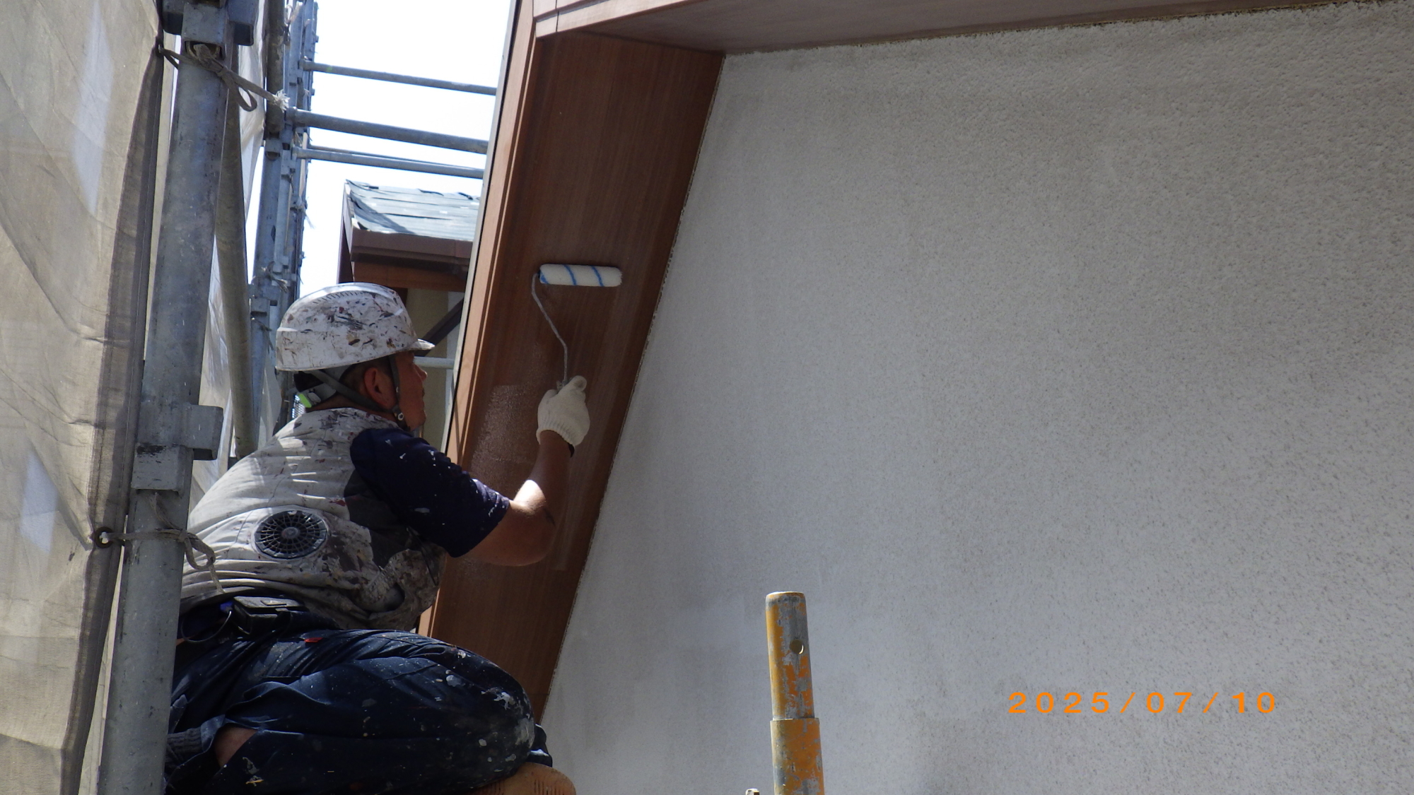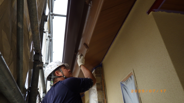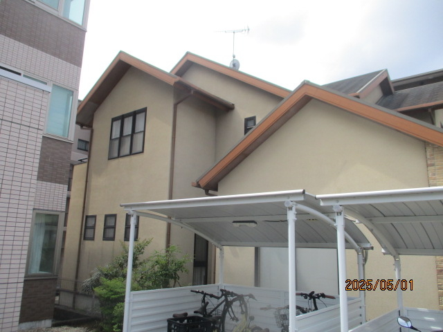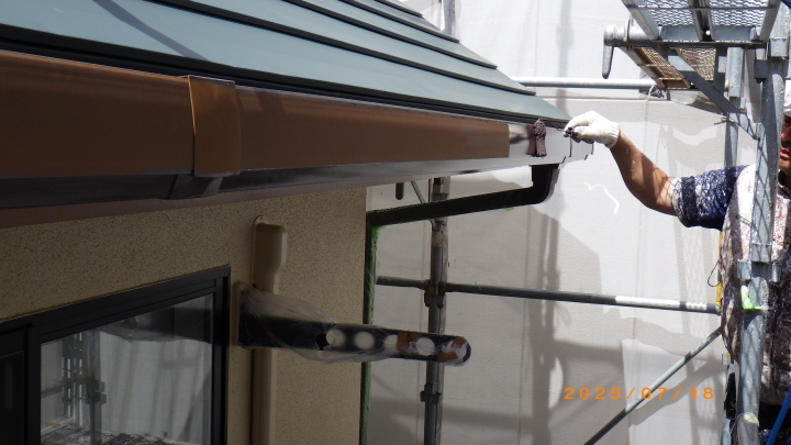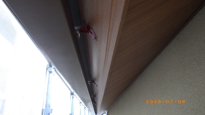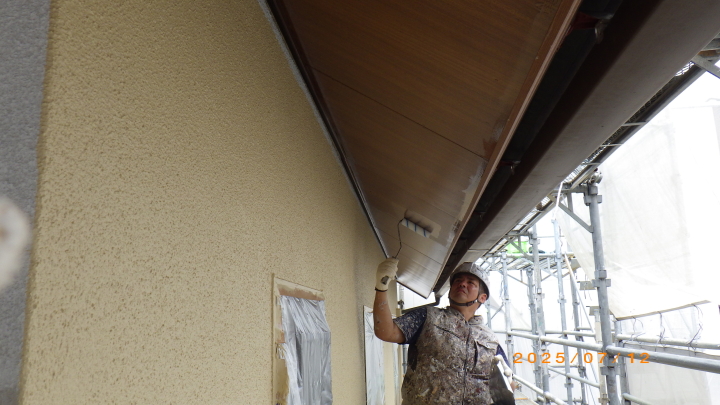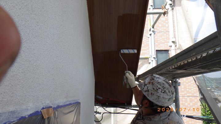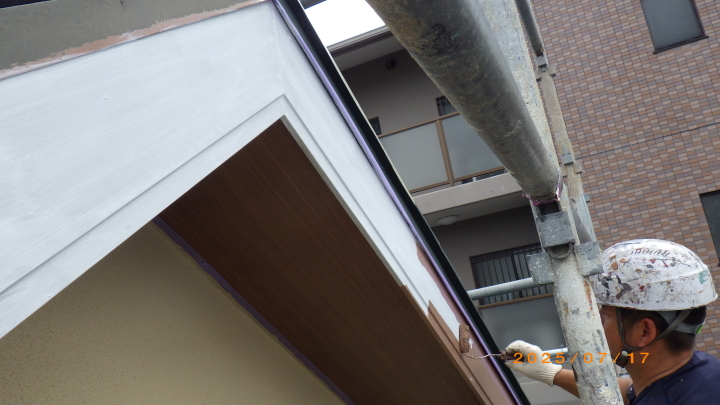 今回の一番苦労した部分になります。軒裏と同じく木目を生かしたクリアー仕上げを考えていましたが破風板コーキング施工するにテープ養生はがす時に劣化部分が浮いて剥がれてしまいましたのでパテ処理を施工塗りつぶし仕上げになりましたが、木目シートの経年劣化による剥離の問題、心配により破風板部分の木目シートをはがすことになりました。木目シートをクリアー仕上げの考え方や外注コーキング工事の施工など気持ちの落ち込みもありましたが、剝がすことによる今後の自然剥離の心配事もなくなります。剥がした後は吸い込み止め、下地の調整のためにフィラー処理2回塗り後、フッソ樹脂塗料上塗り2回りを施工、仕上げになりました。住友林業の建物になりますが最近ではこの木目シートは取り扱いしていないようです、当時の建物の流行や住友林業のこだわりがこの破風板や軒裏になるようですが陽当たり部分には耐用年数を考えると無理があると感じました。