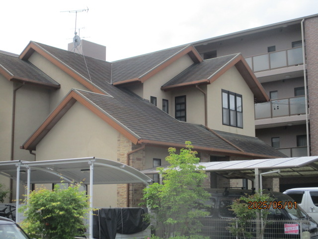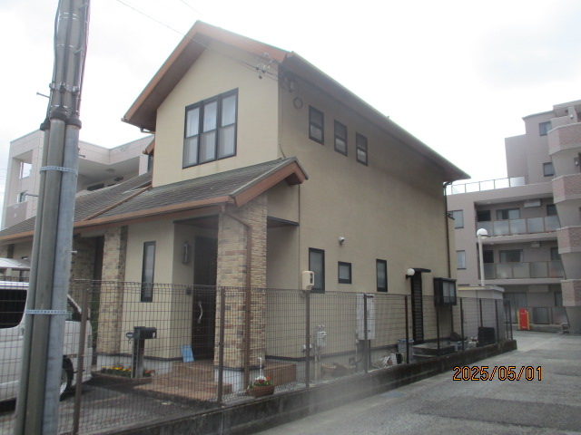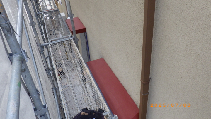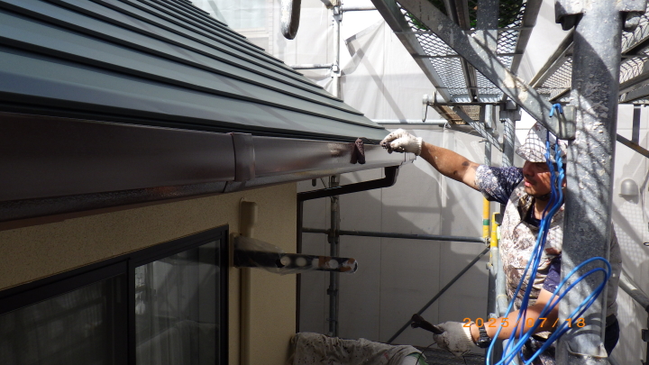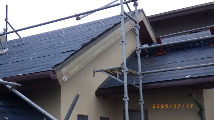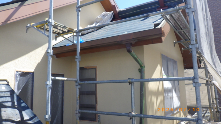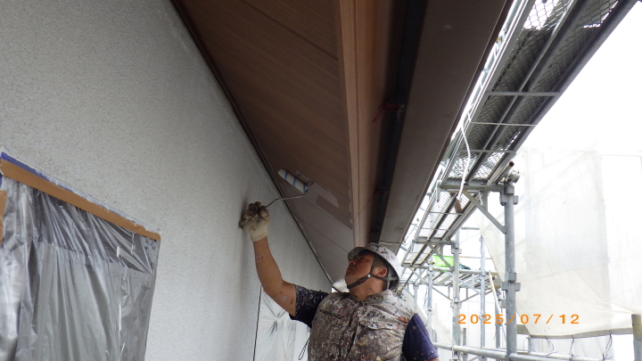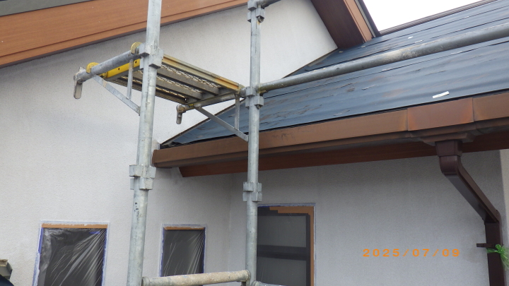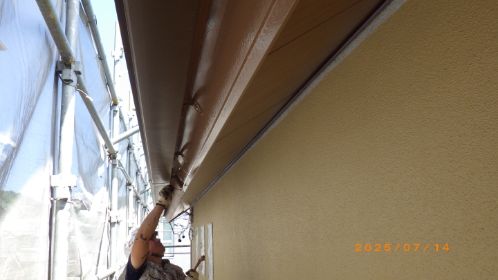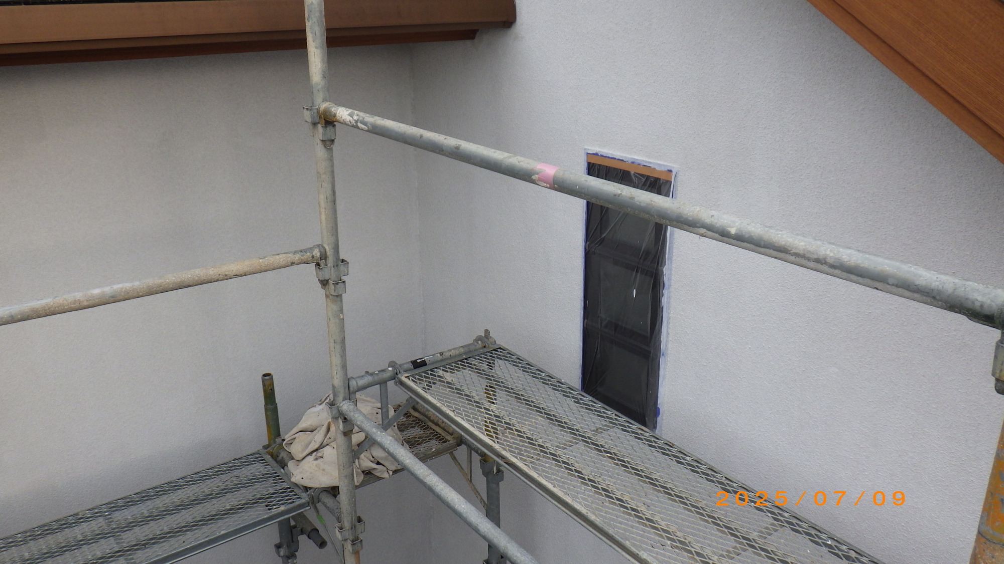 今回の一番苦労した部分になります。軒裏と同じく木目を生かしたクリアー仕上げを考えていましたが破風板コーキング施工するにテープ養生はがす時に劣化部分が浮いて剥がれてしまいましたのでパテ処理を施工塗りつぶし仕上げになりましたが、木目シートの経年劣化による剥離の問題、心配により破風板部分の木目シートをはがすことになりました。木目シートをクリアー仕上げの考え方や外注コーキング工事の施工など気持ちの落ち込みもありましたが、剝がすことによる今後の自然剥離の心配事もなくなります。剥がした後は吸い込み止め、下地の調整のためにフィラー処理2回塗り後、フッソ樹脂塗料上塗り2回りを施工、仕上げになりました。住友林業の建物になりますが最近ではこの木目シートは取り扱いしていないようです、当時の建物の流行や住友林業のこだわりがこの破風板や軒裏になるようですが陽当たり部分には耐用年数を考えると無理があると感じました。