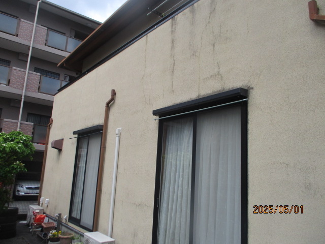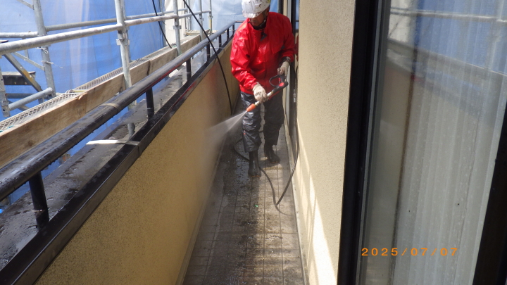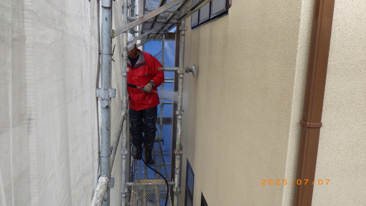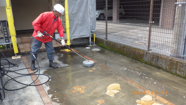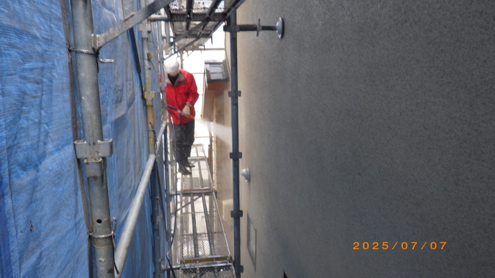 この作業工程は雨降りの日が最適になりますが、なかなか都合よく当日雨の日はありません、ちなみに静岡市の年間降水日数は約93日(グーグルAIによる)だそうです、年間降水量は多いみたいなので、降るときにはまとめて降る感じですね。両隣はマンション、南面はマンションの駐輪場になりますので風向きによる洗浄水の飛散の可能性がありますので念のためブルーシート10m×10mのを西面と南面、東面の駐輪場にも5.4m×3.6mを張りました、ブルーシートの10m物は畳むのも大変ですが風当たりも強くパタパタあおられるので優先的にその面を洗浄して洗い終えたら、すぐさま取り外します。
