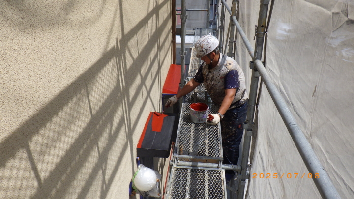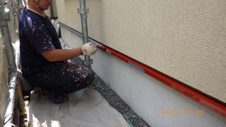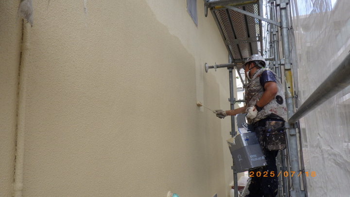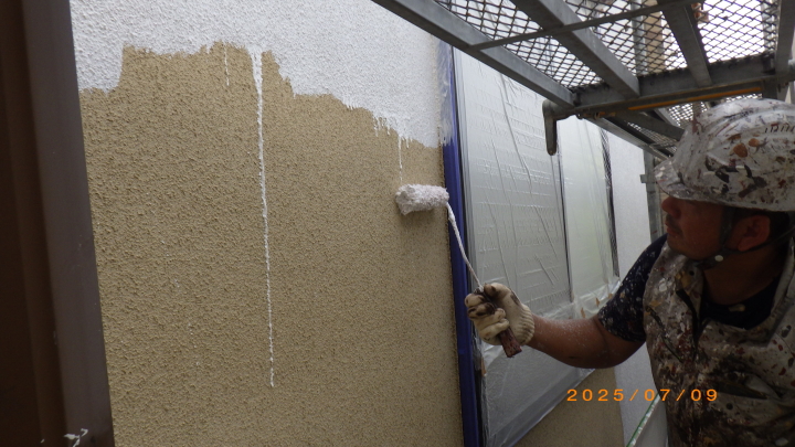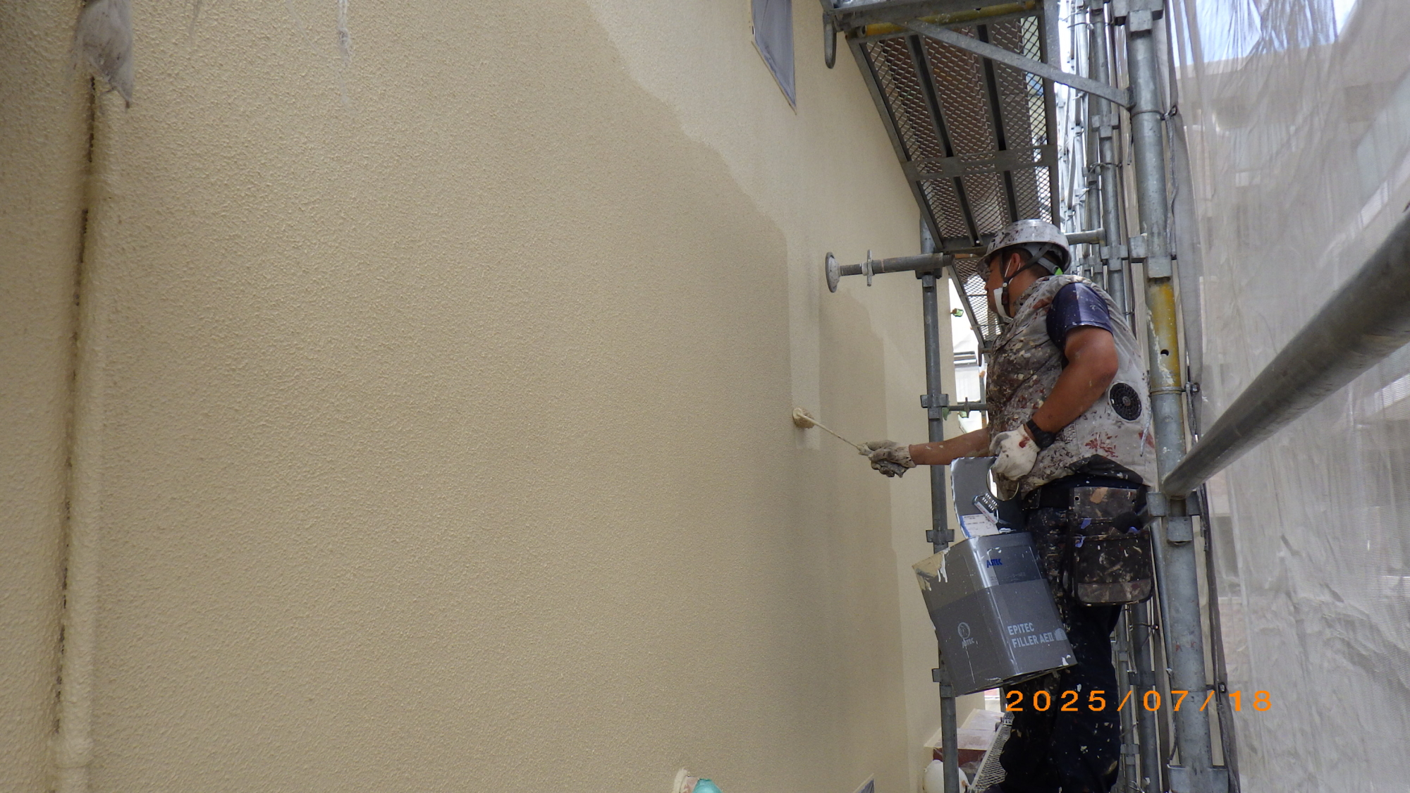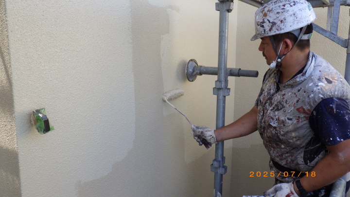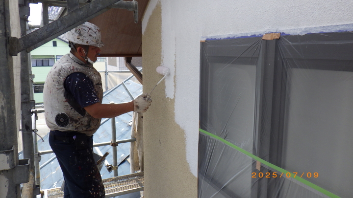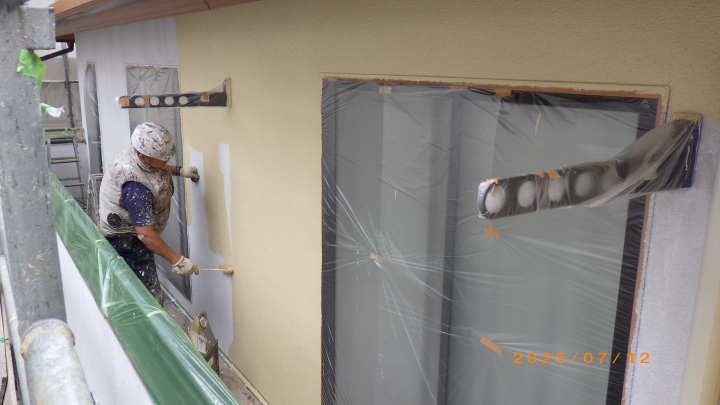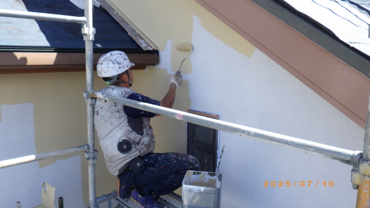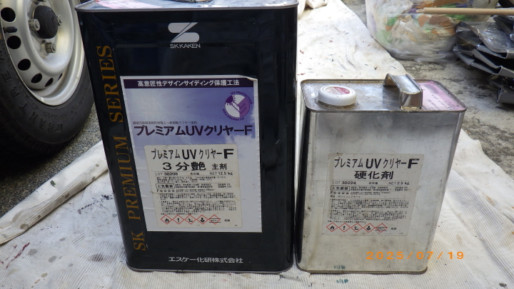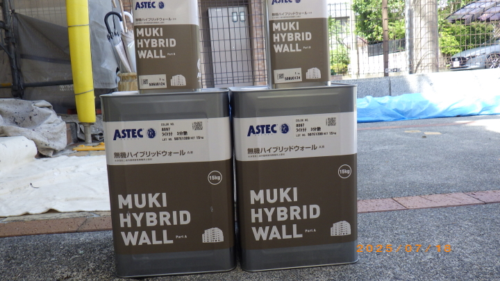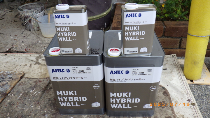 今回は期待耐用年数20年以上の無機塗料を施工します。この塗料は無機成分が約60%含有しています、塗料の耐久性や特性を決める重要な要素として「無機成分」が注目されます。無機塗料では、セラミックやケイ素などの無機物を主成分として配合し、紫外線による劣化がないため半永久的な耐久性が期待されます。100%無機成分なら耐候性は最高によいのですが塗料としての性質では60%含有が限界みたいです、無機成分が数パーセント含有していても無機塗料として販売しているメーカーもありますので、アステックペイントの無機ハイブリッドウォールは高耐久無機塗料としておすすめできる製品です。