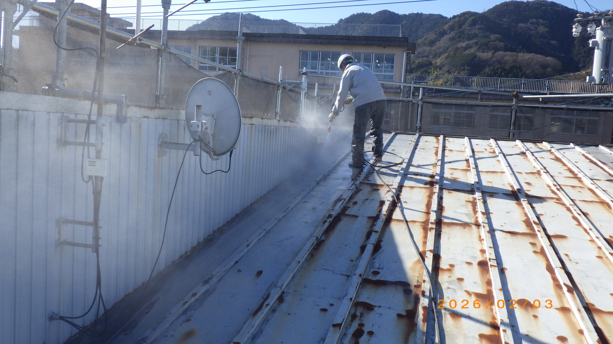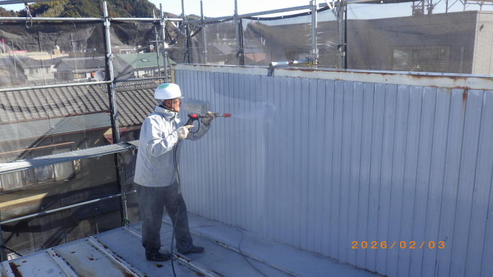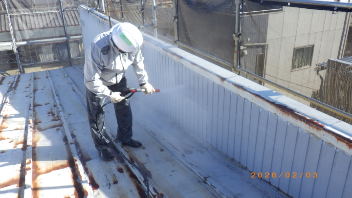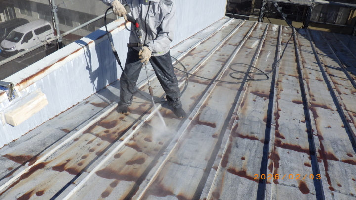 屋根トタン洗浄作業施工中
